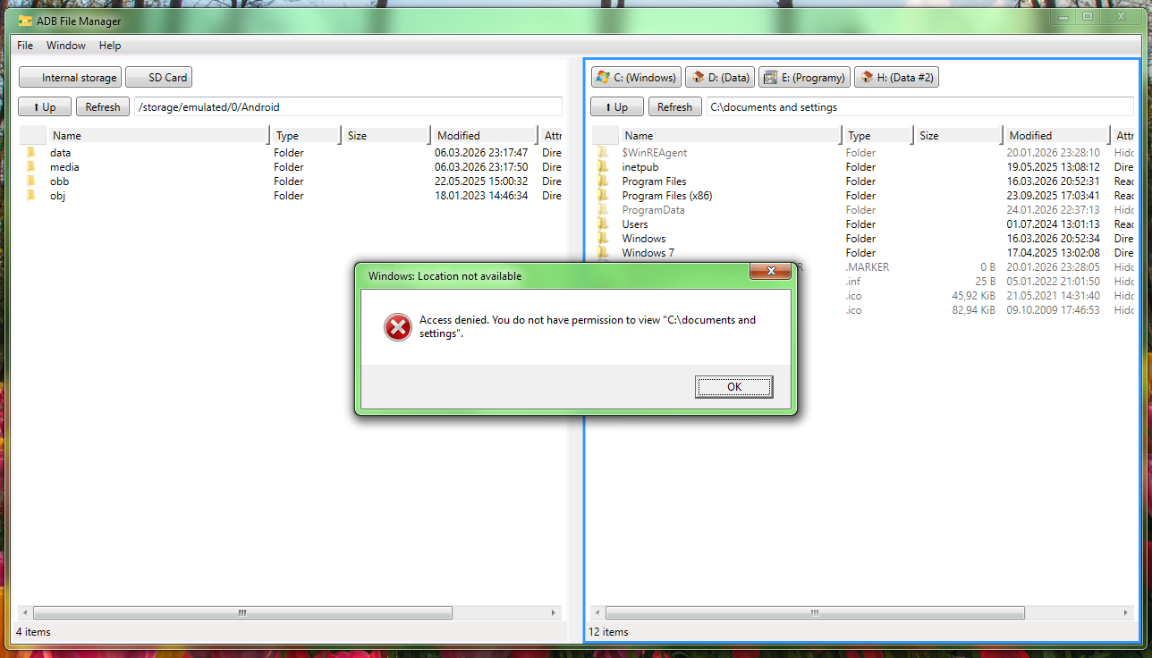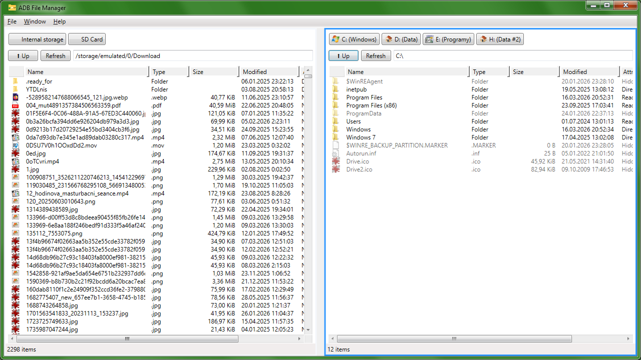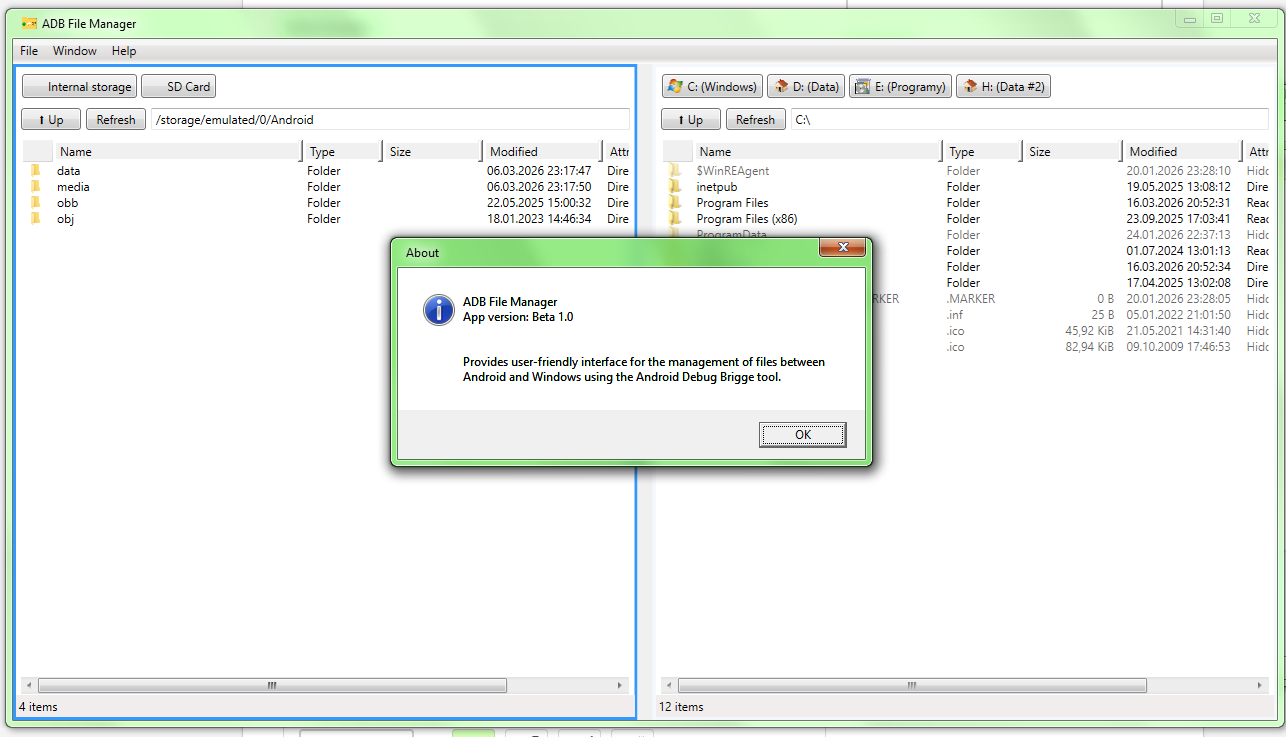 This program provides a more user-friendly graphical interface for moving files between an Android device and a PC using the Android debug bridge